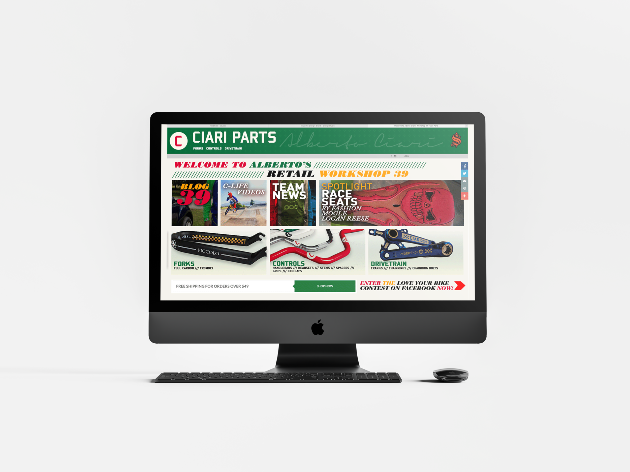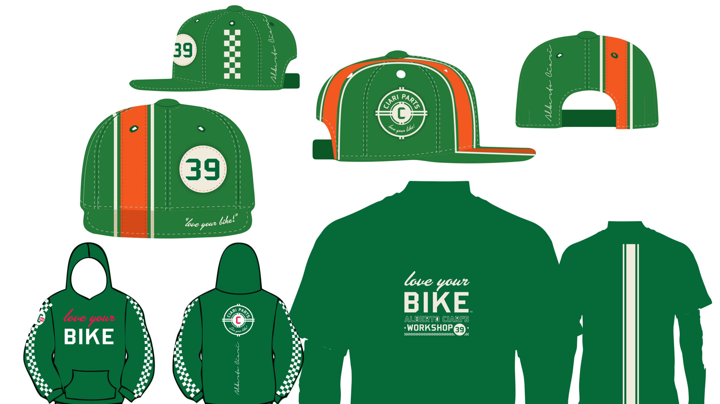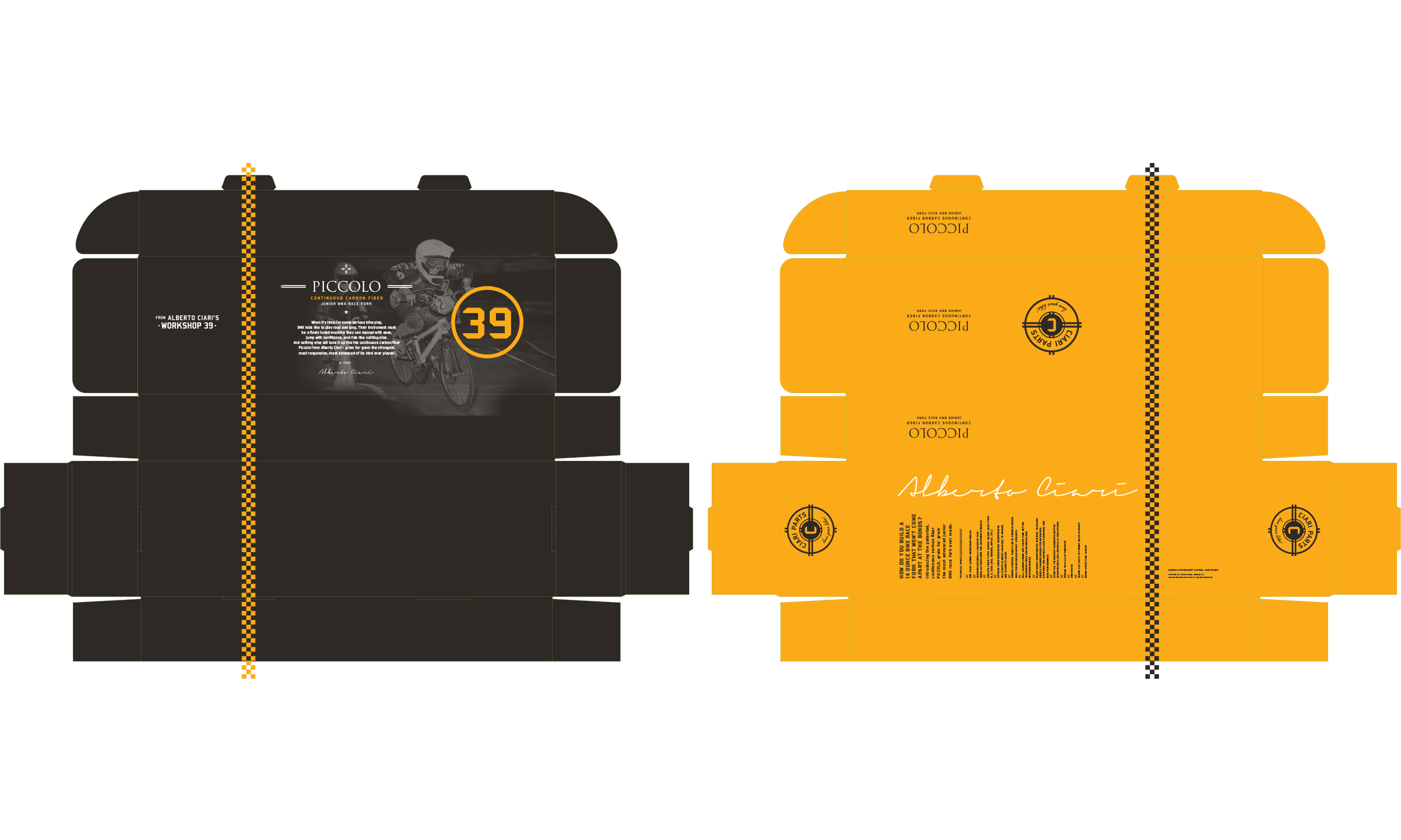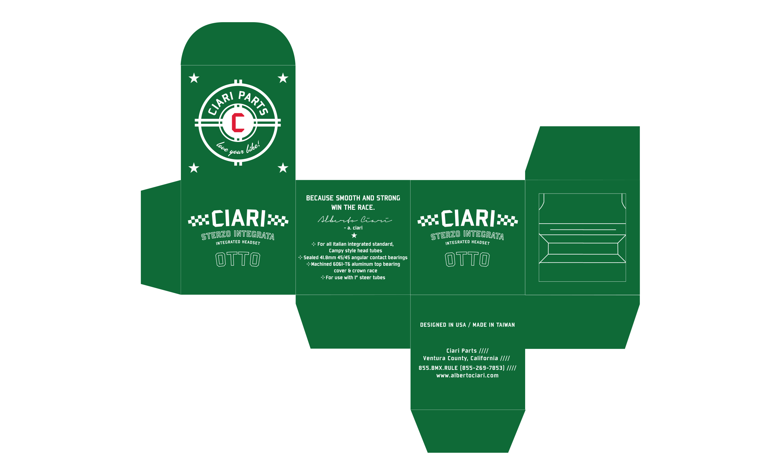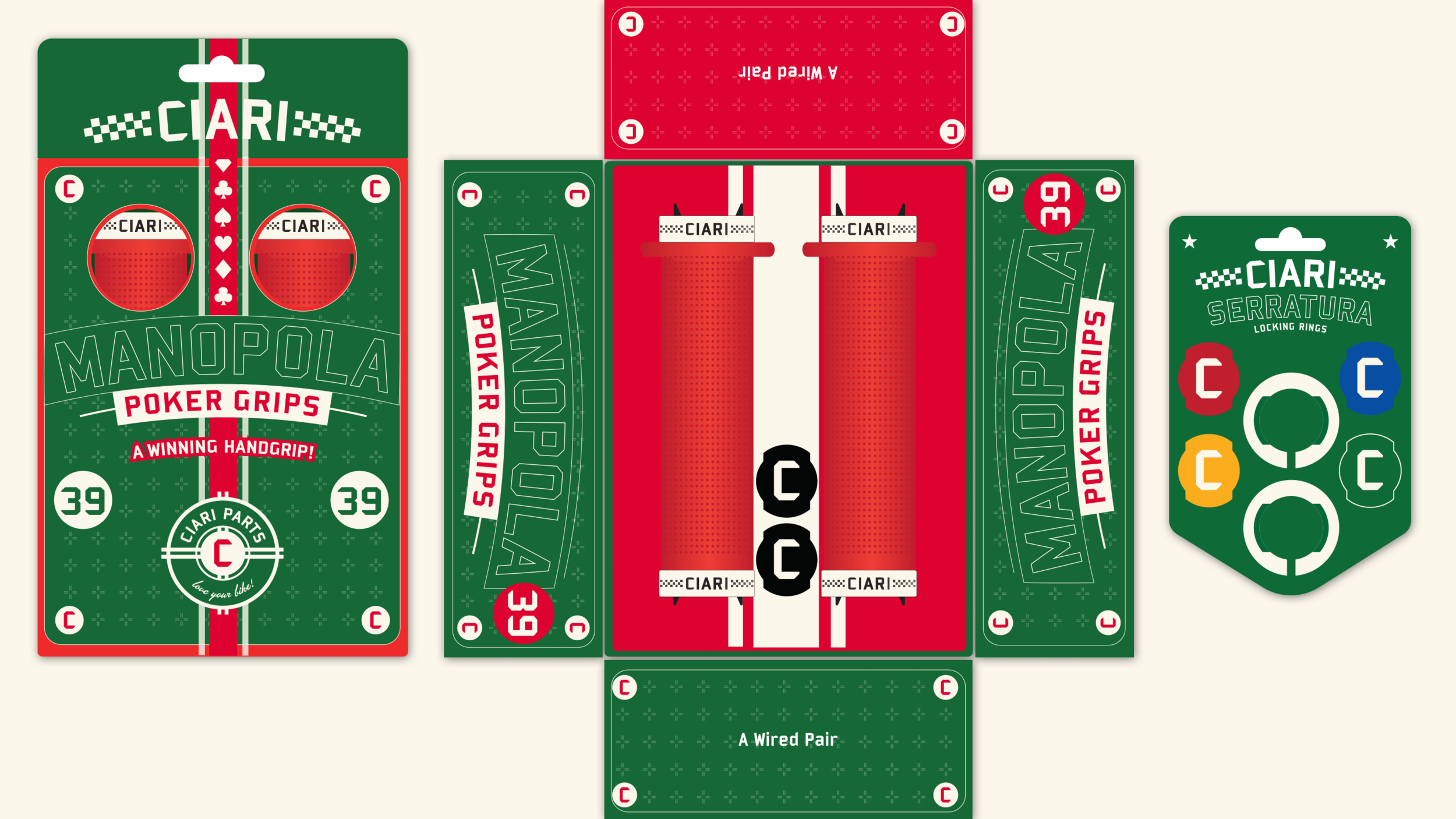 Ciari Parts designs and manufactures components for BMX racing bicycles. The brand was weak and sales were down. I worked with my creative writing partner to revive the brand. First, we needed to make sense of the name. CIARI was an acronym for “crank it and rip it”. That was not going to work. Enter Alberto Ciari, a fictitious character that would become embedded in the minds of all BMX racers and fans…the craftsman behind Ciari’s high quality products. I created a main logo, and several supporting graphics that became key element in rebuilding the brand. We capitalized on Italian racing colors. The use of 39 was Alberto Ciari’s special race number…just so happens it’s also the Italian country calling code.