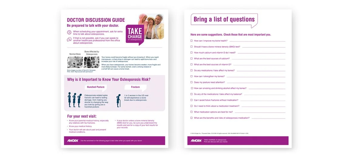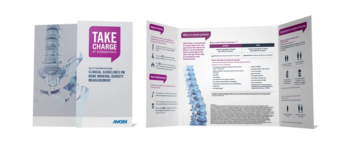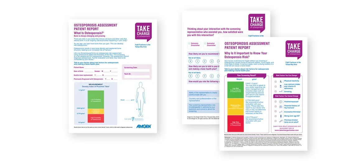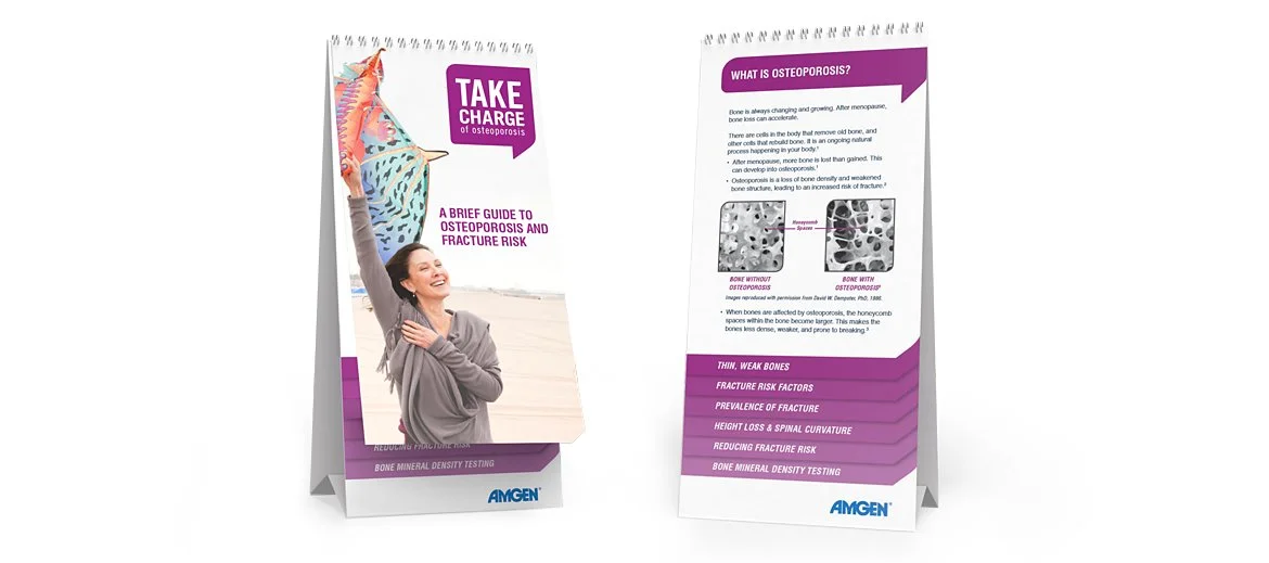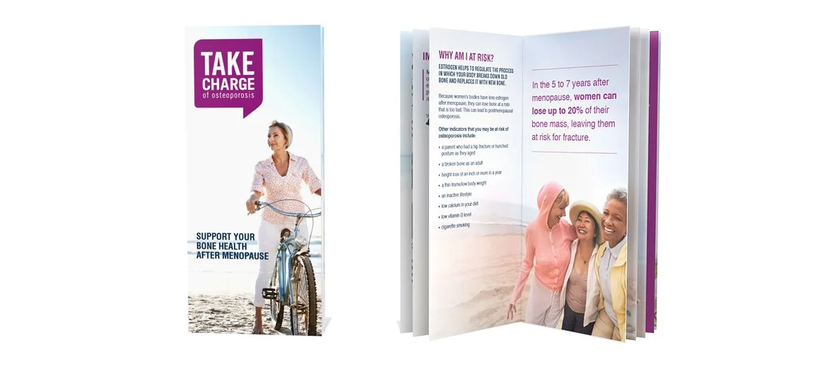 What began as several unrelated materials became a well-defined and interconnected campaign website with a cohesive message and an easy-to-navigate patient journey. The website has made distributing the message and education materials easier and more widespread. I provided design direction in three phases. Phase 1: Develop an engaging logo. The final selection shows the name framed within a talk bubble element to convey conversation for women to take charge of their journey to bone health. Phase 2: Update key print materials for health care providers with imagery, typography, and colors. Phase 3: Create a website, online sign-up form, and reminder emails to get a bone density scan.